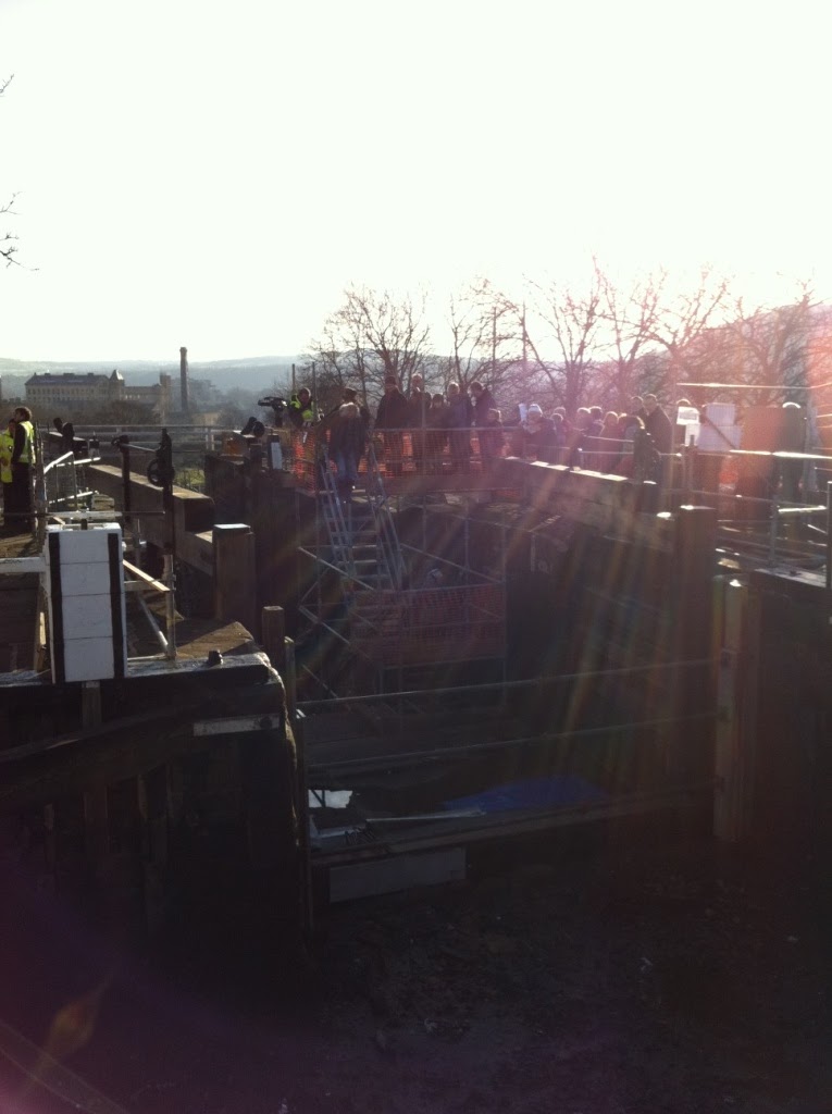 We moved through the five locks and I cursed myself for not bringing my DSLR camera. Plenty of people had and were capturing the day both in stills and on video. Beneath one of the new gates we listened to another volunteer who was explaining about how they were made locally in one of only two workshops in the country capable of doing it. Each door is handmade to fit from English Green Oak and weighs five tonnes. With the weight of the water in the lock when they are operational, each door will weigh nearer twenty-five tonnes. The pairs of doors cost in the region of £25,000 to make and are expected to last up to thirty years. The top set they are replacing had lasted over forty years but with new regulations on the kinds of preservatives that can be used it is unlikely that these new ones will have as long a life.